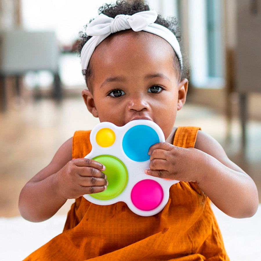 ¡Dedos pequeños no podrán resistirse! Con un marco de plástico ABS resistente y 5 burbujas de silicón de colores, Dimpl es un juguete simple, fascinante y adictivo tanto para bebés como para adultos. Empújalas, presiónalas y pásalas de un lado al otro para horas de exploración sensorial y diversión portátil.