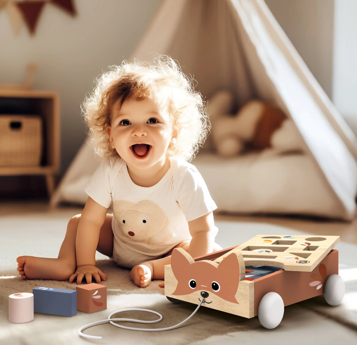 Estimula la motricidad, la coordinación, la conciencia espacial y la resolución de problemas. Su diseño multicolor con simpático zorro, ruedas suaves y madera FSC con pinturas seguras lo hacen resistente, ecológico y perfecto para horas de juego activo y educativo.