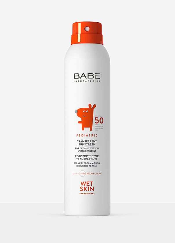 - Fotoprotector pediátrico en spray SPF50+ con su formula "Wet Skin" garantiza una alta protección corporal incluso aplicando el producto sobre la piel mojada.