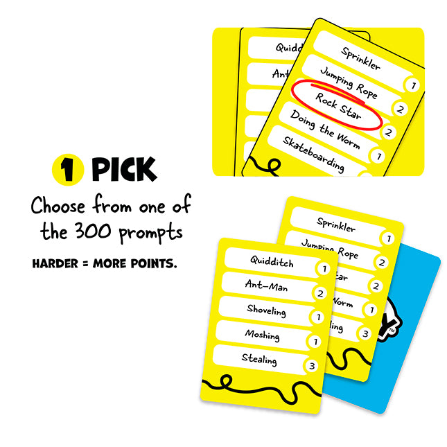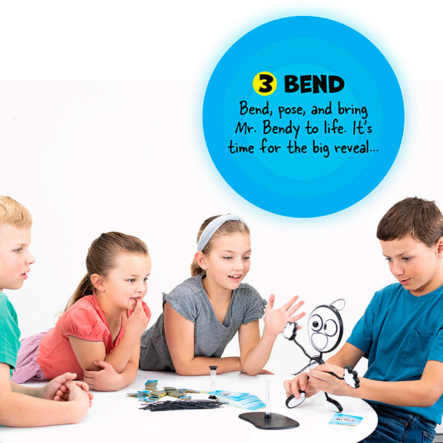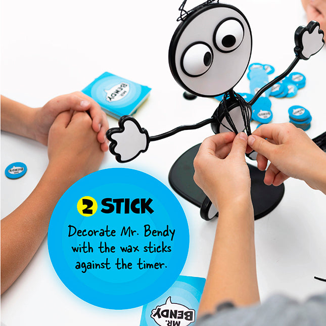 ¡El personaje que puede ser lo que imagines! Da la vuelta a una carta y usa las varillas de cera para transformar a Mr. Bendy en lo que aparezca: un astronauta, un espantapájaros, un golfista y más. Los demás jugadores deben adivinar antes de que el tiempo se acabe. ¡Creatividad, risas y competencia en cada ronda! Gana quien consiga más puntos tras cuatro turnos.