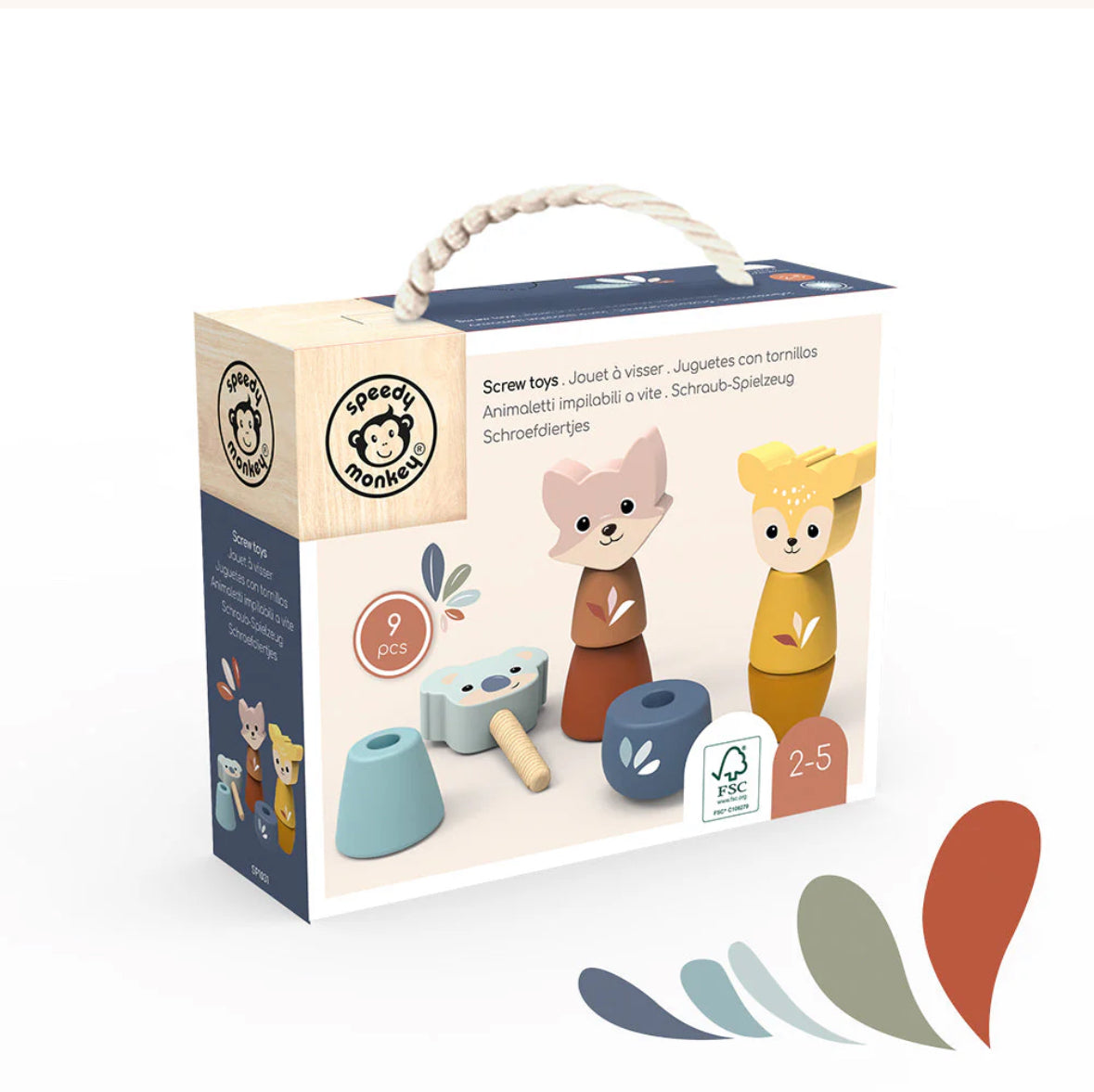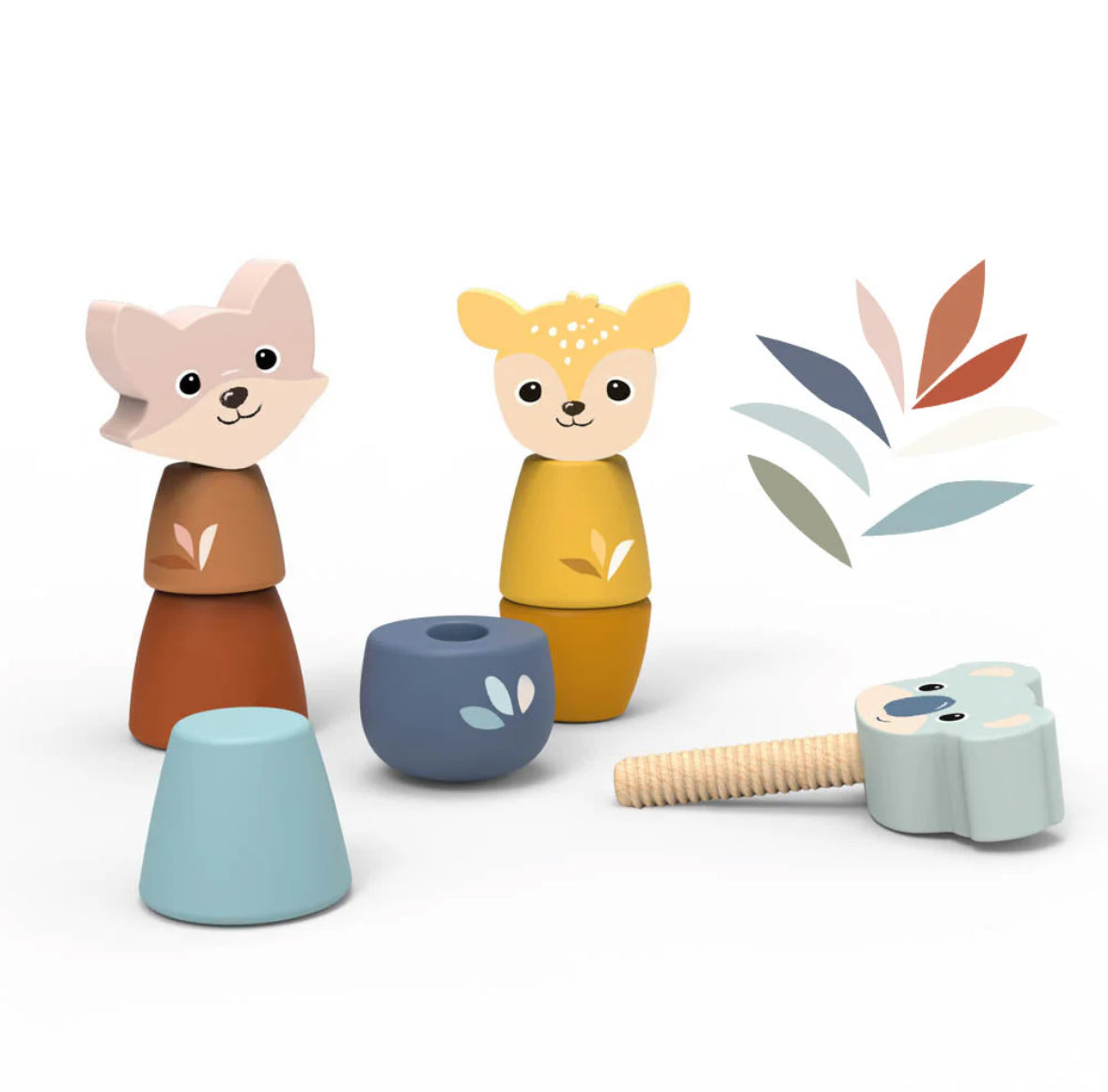 Un juguete de madera colorido que estimula la motricidad fina, la coordinación y la concentración desde los 24 meses. Con formas de animales y piezas enroscables, los niños pueden girar, armar y desarmar mientras aprenden causa y efecto de manera divertida.