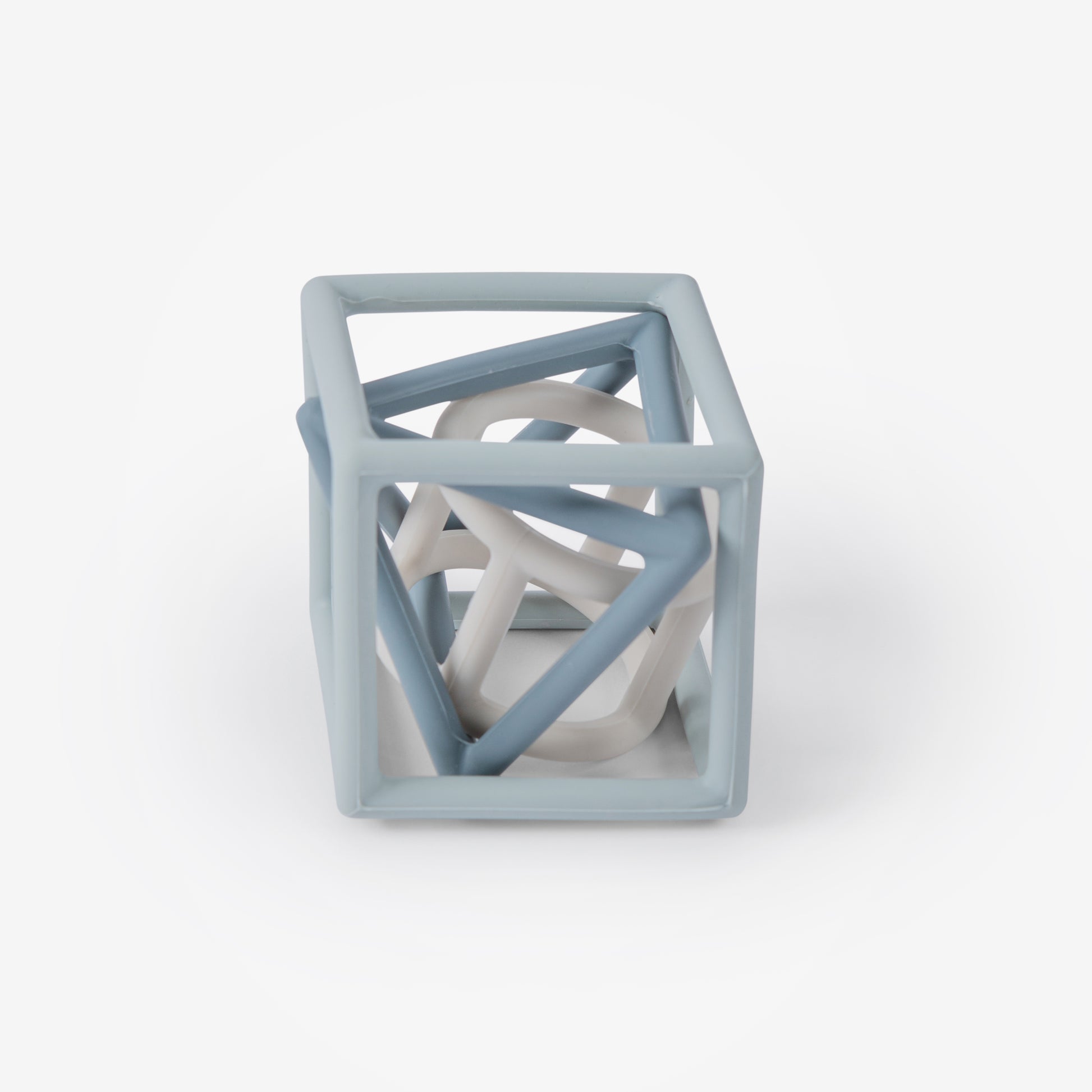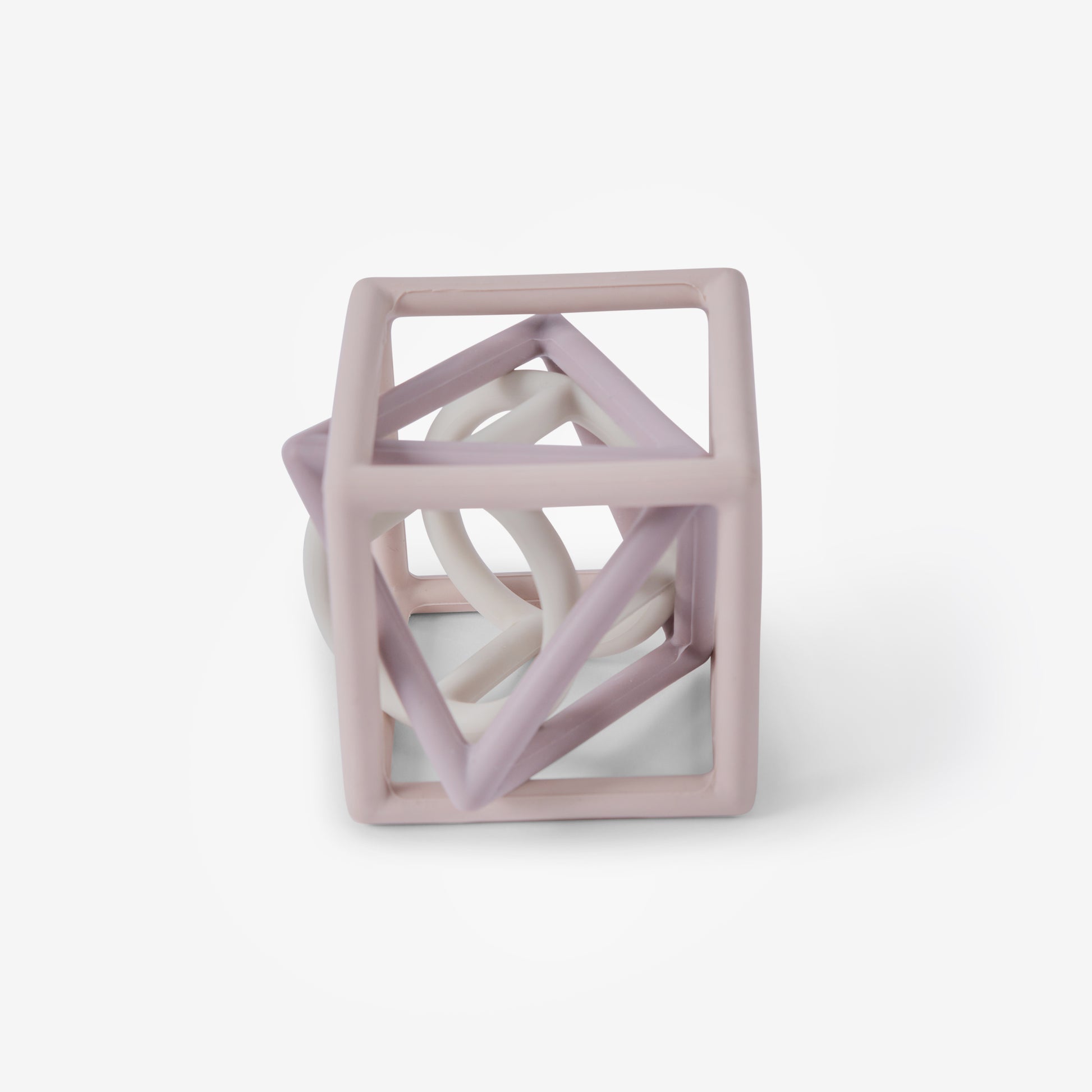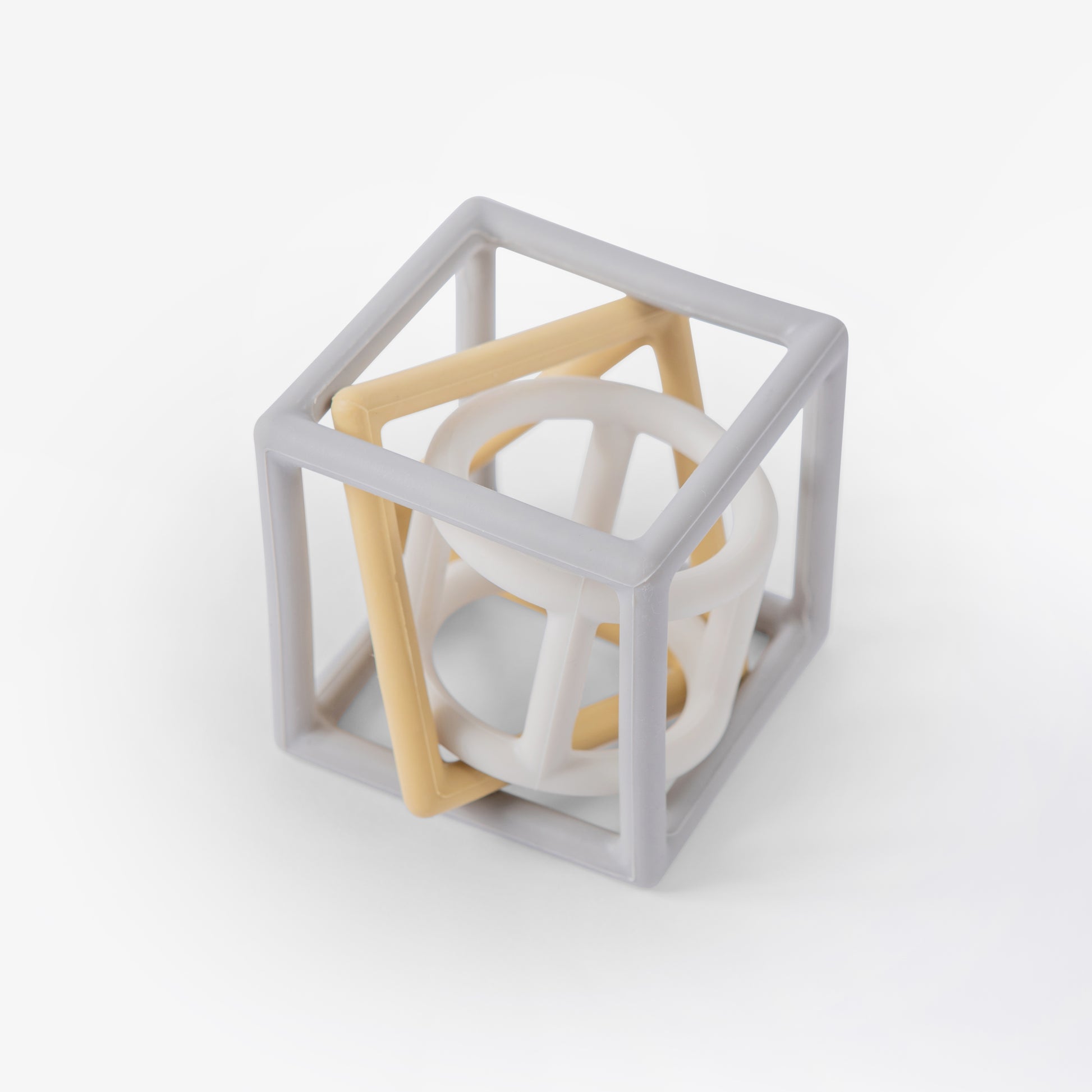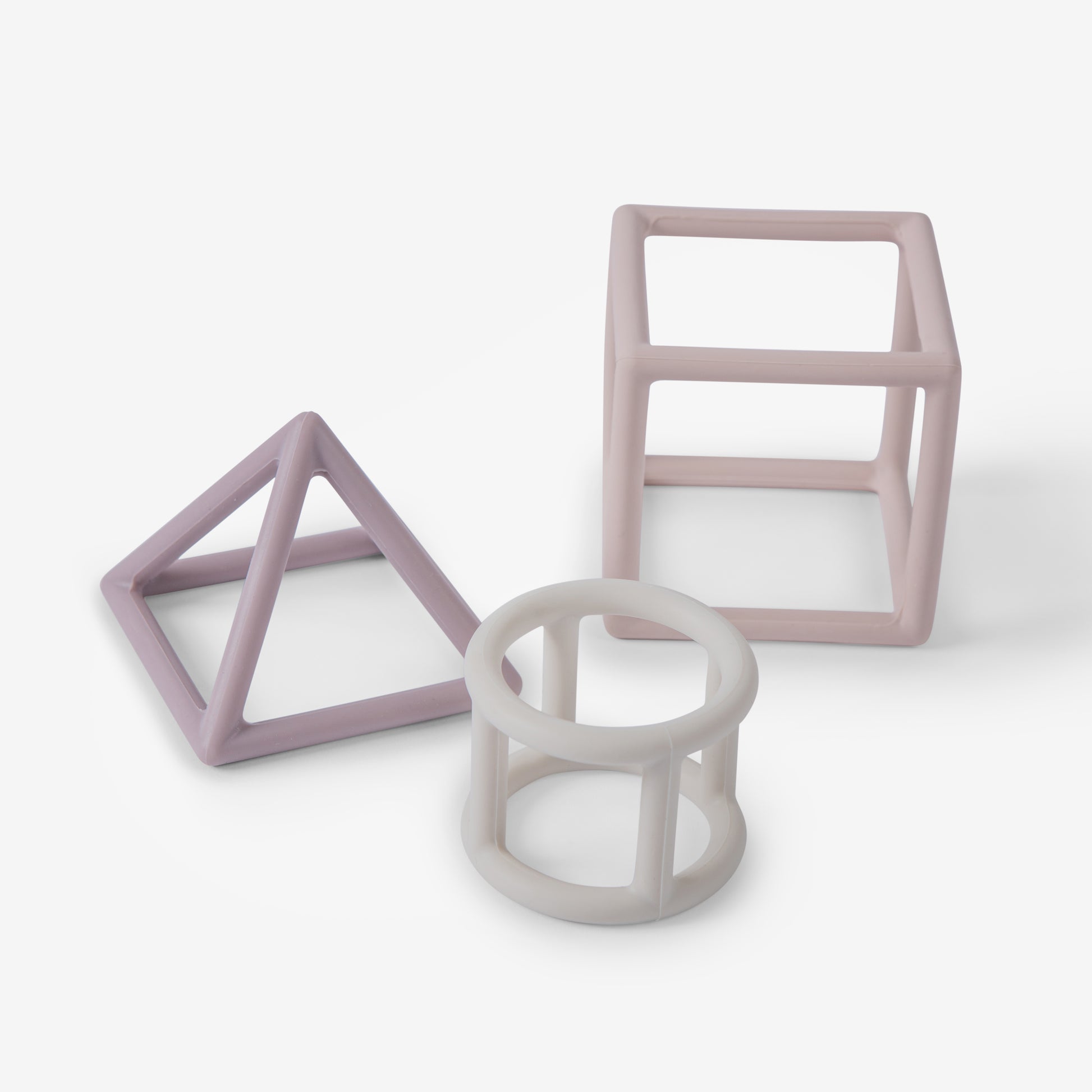 Juguete de estimulación temprana con tres formas tridimensionales que encajan entre sí: cubo, pirámide y cilindro. Fabricado en silicona suave y flexible, perfecta para manos pequeñas. Fomenta la coordinación mano-ojo, la motricidad fina y el juego sensorial.
