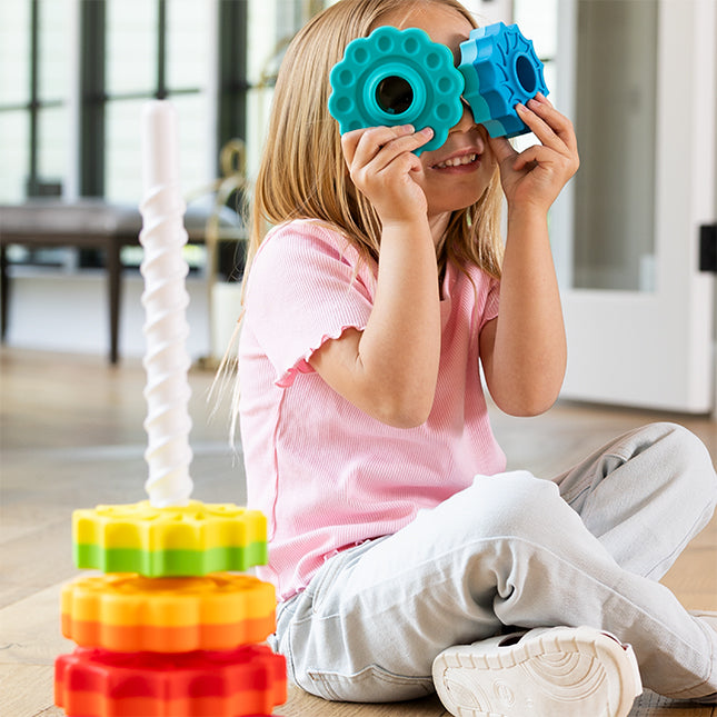 Incluye 6 discos de colores vibrantes en formas alternadas y tamaños que forman un arcoíris dinámico. Los niños pueden ordenar por tamaño, color o forma, mientras desarrollan coordinación ojo-mano y habilidades de ingeniería temprana.