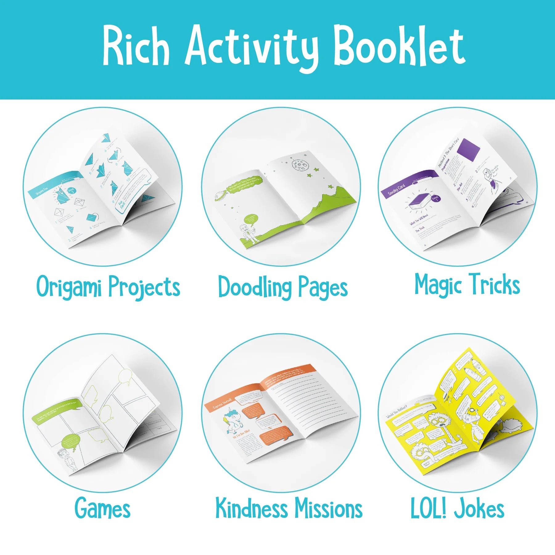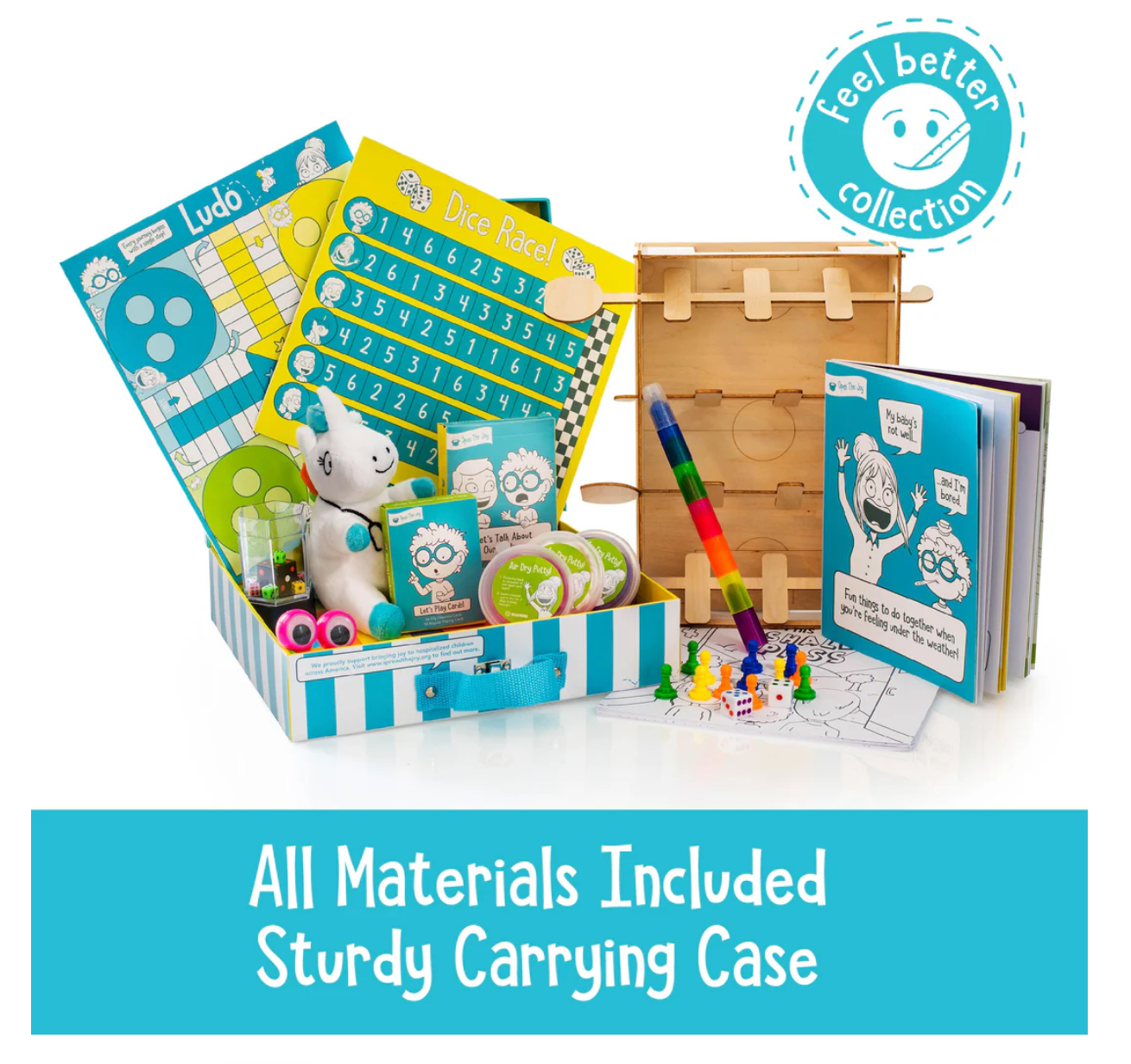 Un kit completo con actividades creativas, juegos de conversación, origami, pintura, stickers y más. Diseñado para reconfortar y entretener a los niños ¡sin pantallas!