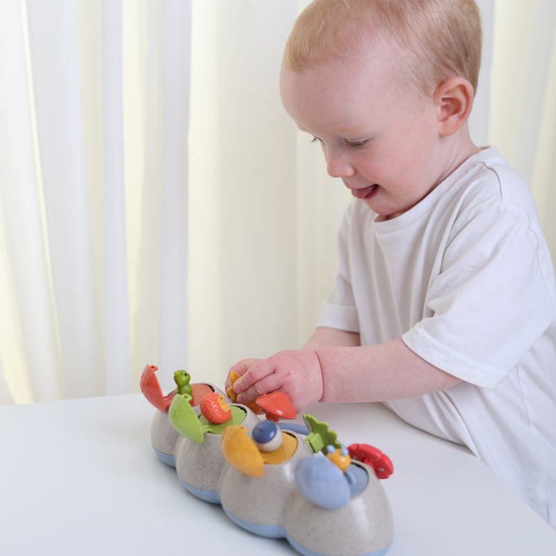 Un juguete interactivo que despierta la curiosidad con cuatro mecanismos distintos: presionar, jalar, girar y apretar. Presenta adorables escenas del bosque —la abeja y la flor, el erizo y el hongo, la oruga y la mariposa— fomentando el juego imaginativo, el reconocimiento de colores y formas, y la relación entre personajes.